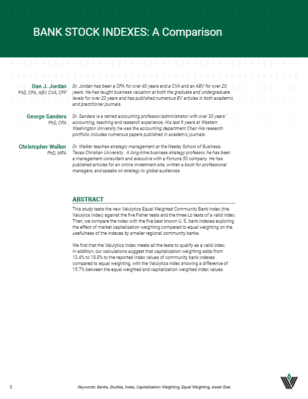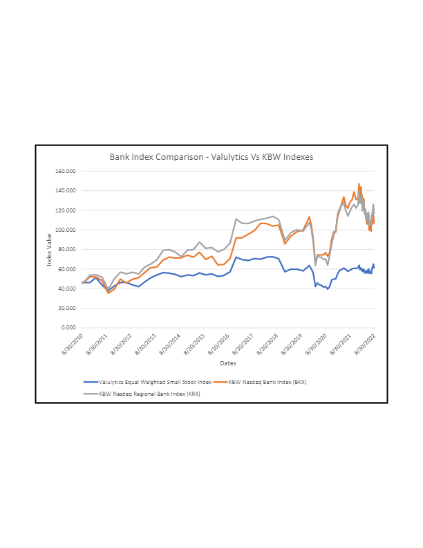 Valulytics research into Bank stock indexes shows that small bank stocks are under-represented in both the KBW Bank Stock Index (BKX) and the KBW Regional Stock Index (KRX) (see our research paper here). To remedy this situation, we have developed our Valulytics Equal Valued Small Stock Bank Index. Index values are graphed at the left.